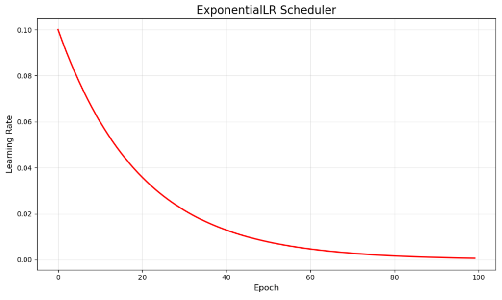 ExponentialLR smoothly reduces the learning rate by multiplying it by a decay factor each epoch. Our example uses a 0.95 multiplier, creating the smooth red curve that starts at 0.1 and gradually approaches zero.
