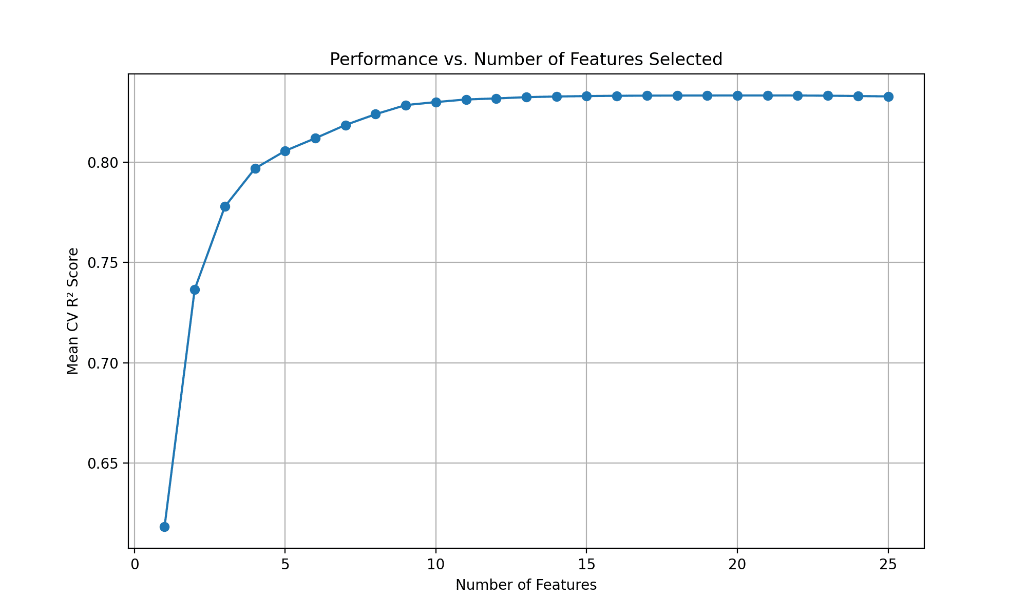 # Prepare to store the mean CV R² scores for each number of features mean_scores = []